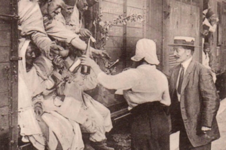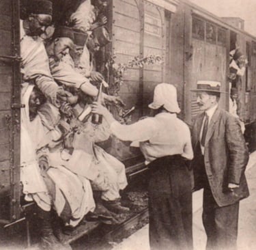 Sur le quai d'une gare, une femme donne du champagne à des tirailleurs en partance pour la guerre